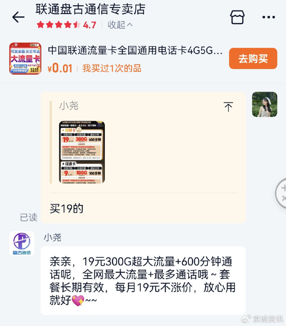 近日,消费者王先生(化名)向记者反映,其在某宝“联通盘古通信专卖店”购买电话卡时遭遇虚假宣传,商家承诺的优惠套餐与实际激活套餐严重不符,且存在强制预存话费的情况,自身合法权益受到侵害。 据王先生介绍,2025年12月11日,他在淘宝“联通盘古通信专卖店”下单购买电话卡,商家页面宣传该电话卡“19元每月享300G全国流量+600分钟通话,长期有效、每月不涨价”,同时强制要求需先充值100元方可激活。12月13日,王先生收到短信提示办理成功。